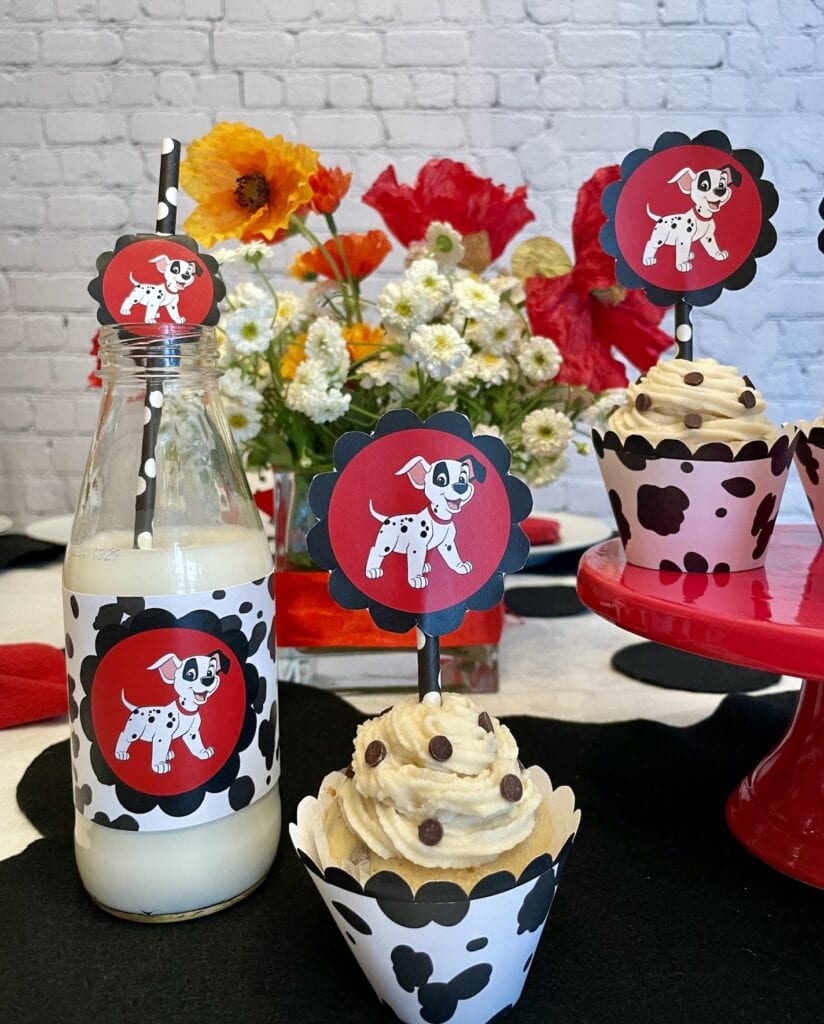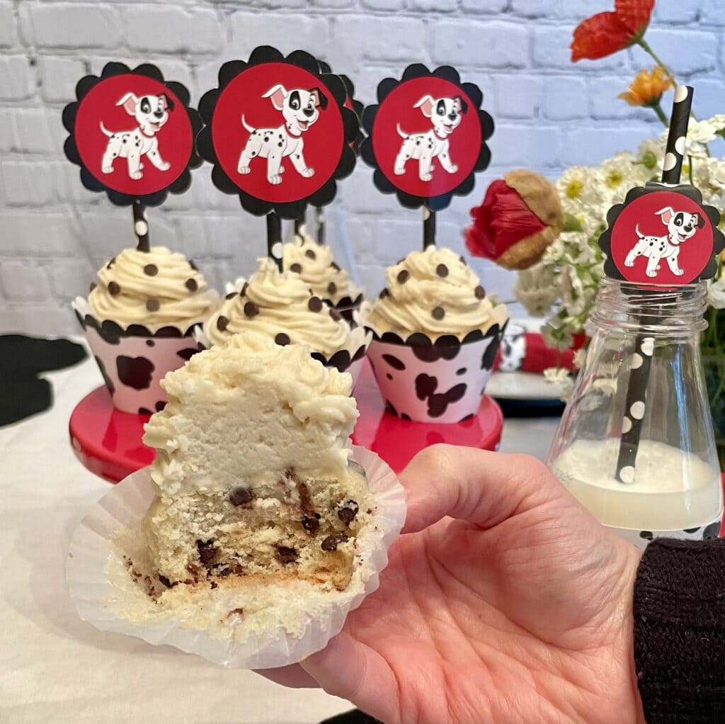 - Decorate the cupcakes: Frost the cooled cupcakes using your favorite piping tip. Sprinkle additional mini chocolate chips over the frosting to create Dalmatian “spots.” Finish with Dalmatian-themed wrappers and 101 Dalmatians cupcake toppers.