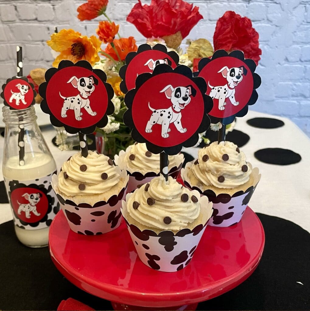 - Decorate the cupcakes: Frost the cooled cupcakes using your favorite piping tip. Sprinkle additional mini chocolate chips over the frosting to create Dalmatian “spots.” Finish with Dalmatian-themed wrappers and 101 Dalmatians cupcake toppers.