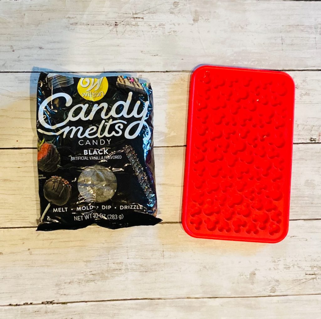 Make Mickey “Seeds” – While cookie dough chills, melt black candy melts according to package instructions. Prepare piping bag with a small round tip and fill with melted black candy melts. Carefully pipe candy melts into the small Mickey reservoirs. You will need 5 Mickeys for each cookies. Place in refrigerator and allow to harden. When firm, pop out of mold and set aside.