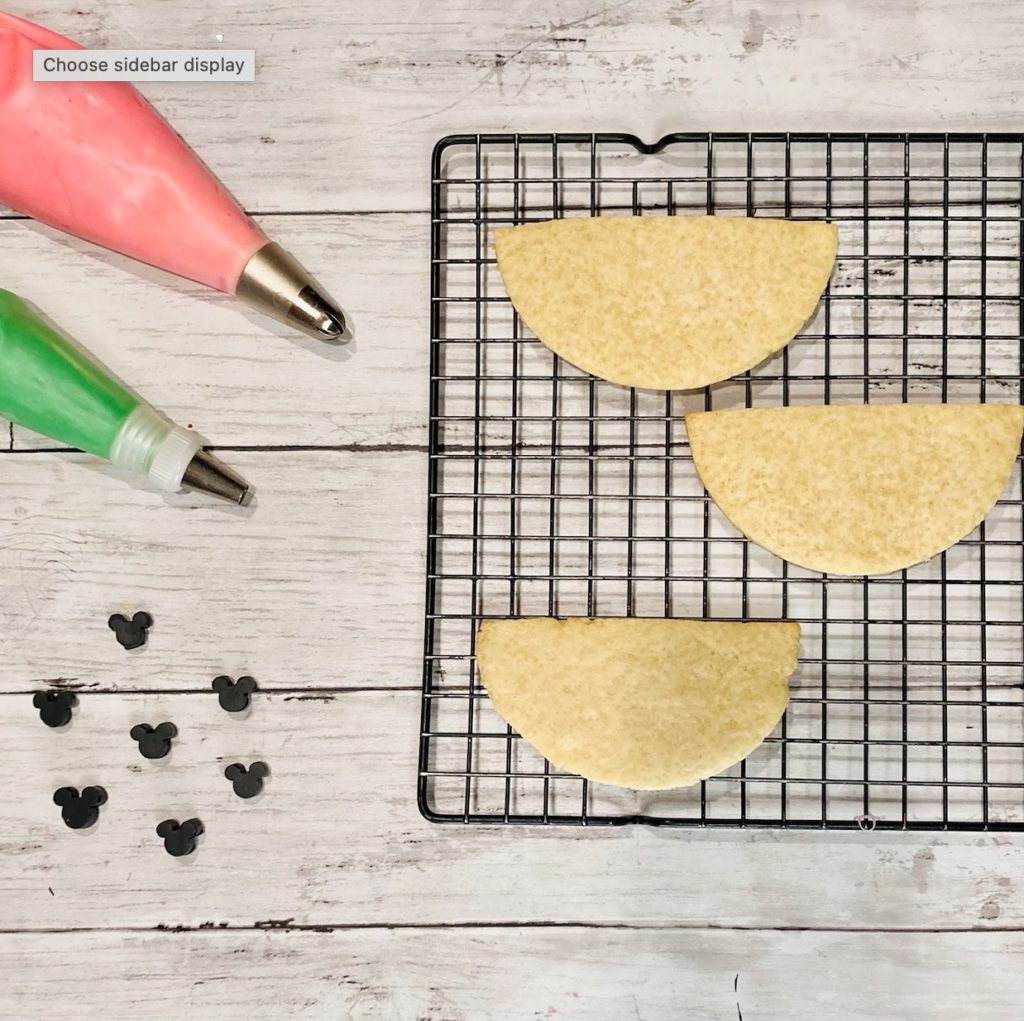Decorate Cookies – Prepare piping bag with medium round tip and fill with green frosting. Carefully pipe along circular boarder of each cookie. Next prepare a piping bag with large star tip and fill with pink frosting. Fill in unfrosted area with pink stars until completely filled. Arrange five Mickey “seeds” over pink frosted area.