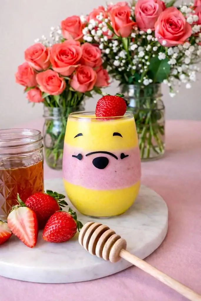 For our Winnie the Pooh breakfast, we served these smoothies in stemless wine glasses embellished with removable vinyl clings created on our Cricut featuring Pooh’s sweet facial details. The clear glass allows the layered colors to shine, while the subtle character touch adds charm without overwhelming the table. Naturally sweet and packed with fruit, this smoothie is a healthy option that still feels festive and thoughtfully styled.